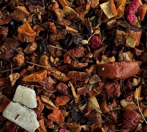 Zutaten: Apfelstücke (Apfel, Säuerungsmittel: Citronensäure), Karottenstücke, Hagebuttenschalen, Orangenschalen(6%), Rote Betestücke, natürliches Aroma, Aloe Vera (Aloe Vera, Zucker, Antioxidationsmittel: Schwefeldioxid)(2%), Quendelkraut, Schafgarbenkraut, Vitamin C, Himbeeren, Rote Johannisbeeren(1%), Süßkraut.