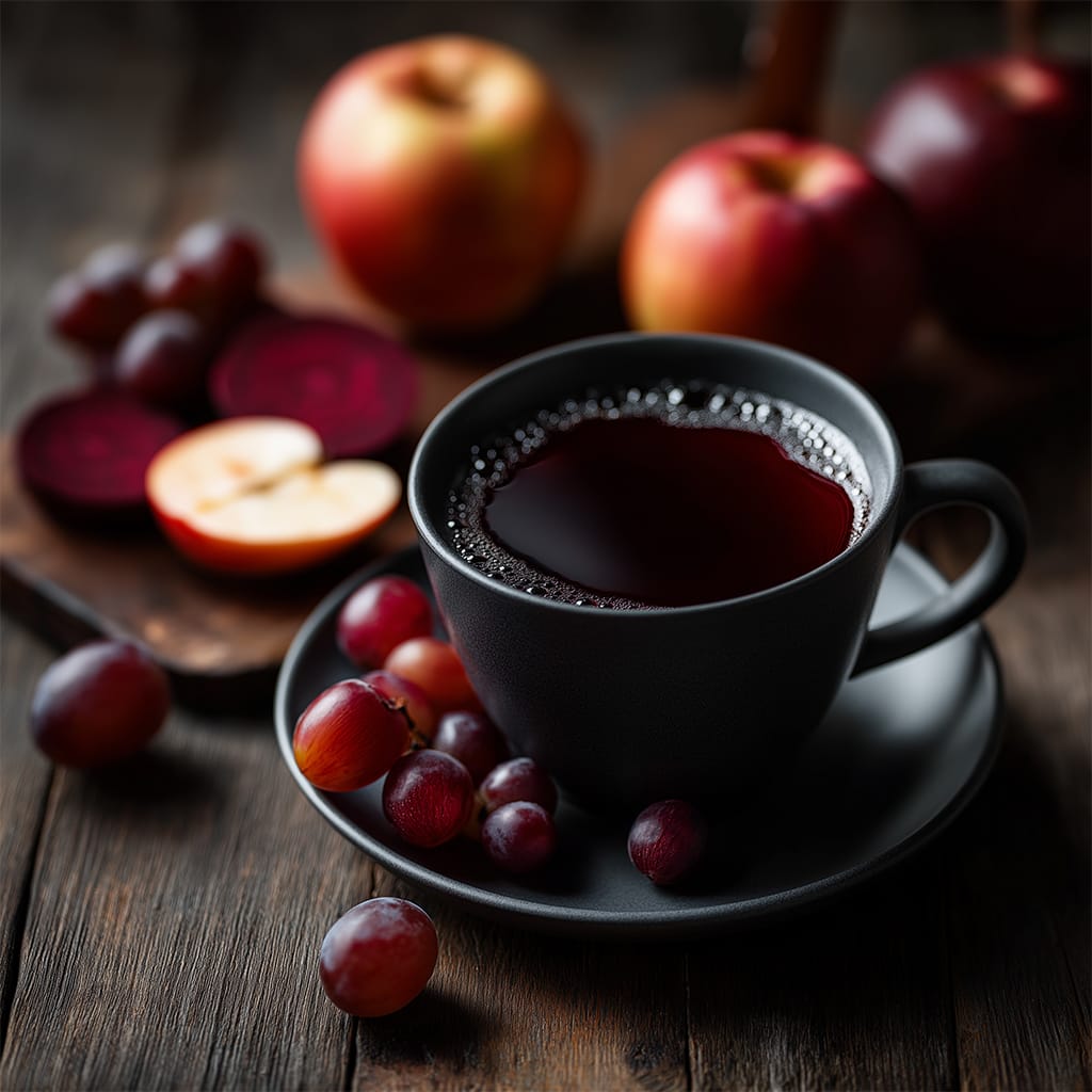 Die Basis bilden saftige Apfelstücke, die mit feinen Korinthen für eine angenehme Süße sorgen. Gesäuerte Apfelstücke bringen eine leichte, spritzige Frische in die Tasse. Abgerundet wird der Tee durch Rote-Betestücke, die ihm eine leuchtend rote Tassenfarbe verleihen und das Aroma noch voller wirken lassen. Der Geschmack der tiefroten Traube entfaltet sich dabei samtig, intensiv und rund – für ein fruchtiges Erlebnis, das nach sonnengereiften, saftigen Früchten schmeckt.