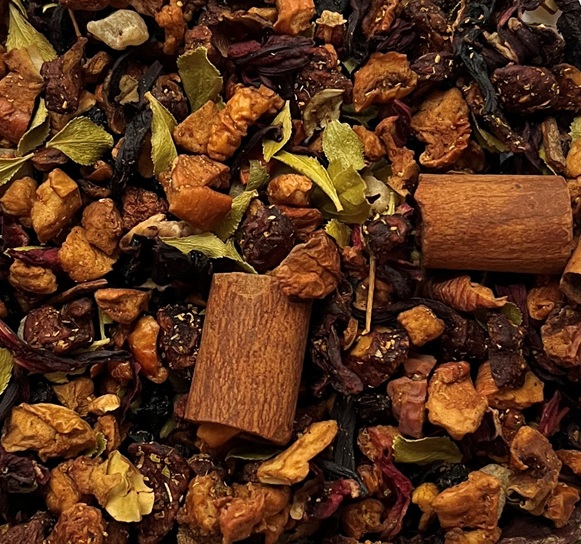 Zutaten: Apfelstücke, Hibiskusblüten, Ananaswürfel (Ananas, Zucker, Säuerungsmittel: Zitronensäure), Fliederbeeren, gesäuerte Apfelstücke (Apfel, Säuerungsmittel: Zitronensäure), Aroma, Zimtstücke, Zimtstangen, Buchublätter, Holunderblüten.