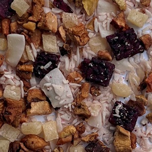 Zutaten: Ananaswürfel (Ananas, Zucker, Säuerungsmittel: Zitronensäure), Apfelstücke, lila Drachenfruchtwürfel (Drachenfrucht, Reismehl), Kokosraspeln, Kokoschips, natürliches Aroma, Granatapfelkerne.