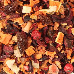 Zutaten: Apfelstücke (Apfel, Säuerungsmittel: Zitronensäure), Hibiskusblüten, Weinbeeren, Karottenstücke, natürliches Aroma, Rote Beetestücke, Orangenschalen, kandierte Ananasstücke (Ananas, Zucker), kandierte Papayastücke (Papaya, Zucker), kandierte Mangostücke (Mango, Zucker), Cranberries, rote Johannisbeeren(1%)
